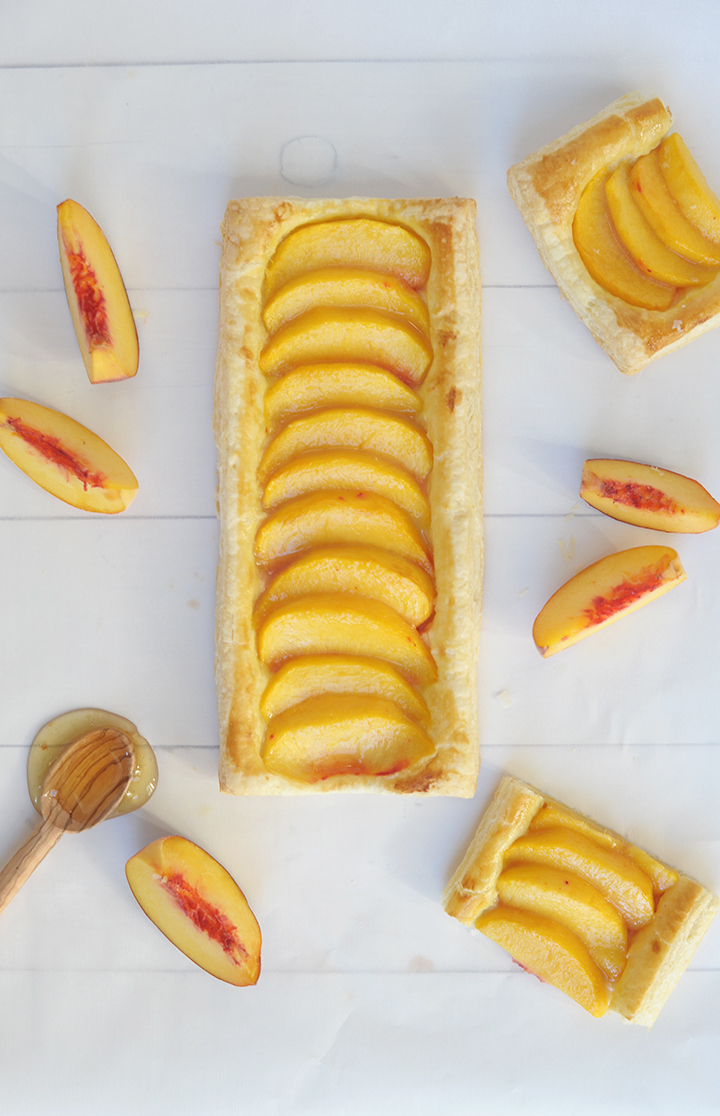 Start placing peach slices in an overlapping row down the center of each puff pastry.