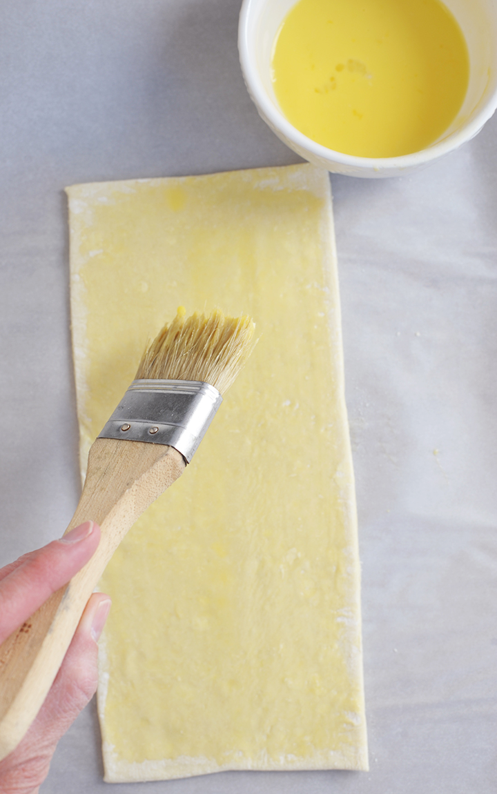 Brush egg wash (egg yolk plus 1 teaspoon water) on each puff pastry rectangle.