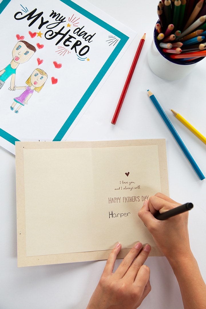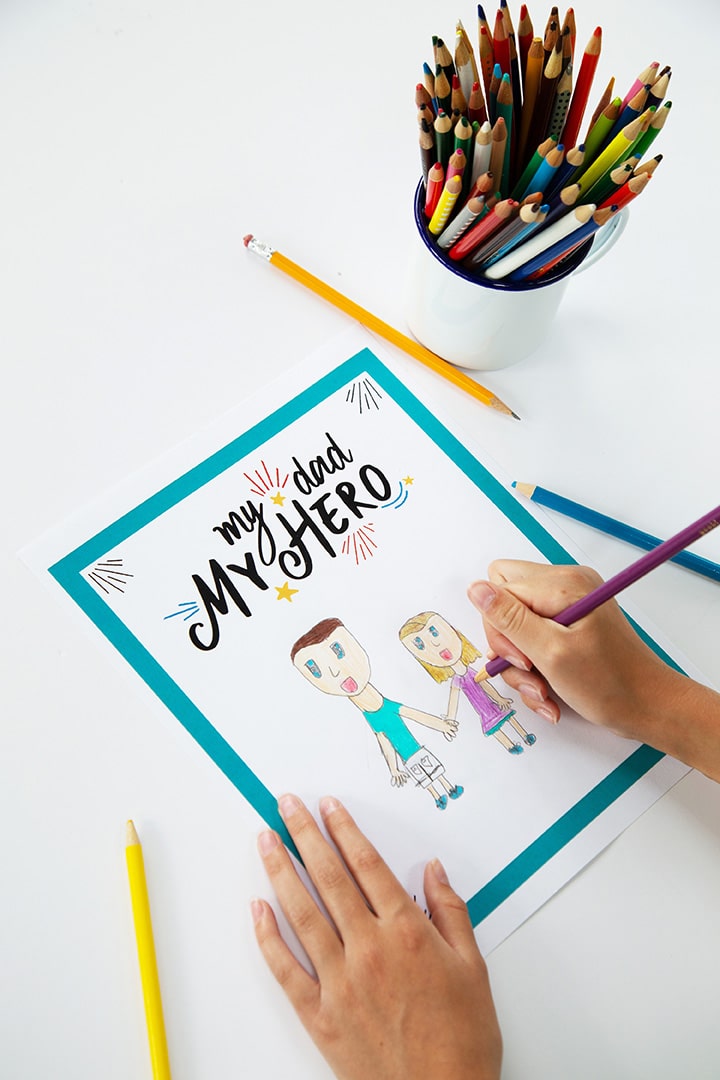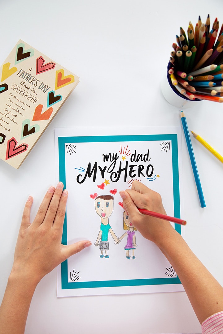 Father’s Day is right around the corner. It is a day to celebrate all the dads in your life – to do something special for your dad, uncles, grandpas, and friends. We love to celebrate Father’s Day with a handmade gift, something heartfelt, and a Father’s Day card from Target. What better way to top these gifts than with a sweet and sentimental (or humorous) greeting card? We also are sharing a cool free printable for dads. It is titled, “My Dad, My Hero”. The kids can draw a portrait of their dad on the printable. This is such a personal way to give dad a unique and thoughtful gift. And how fun to be able to keep the drawing for years and years.
