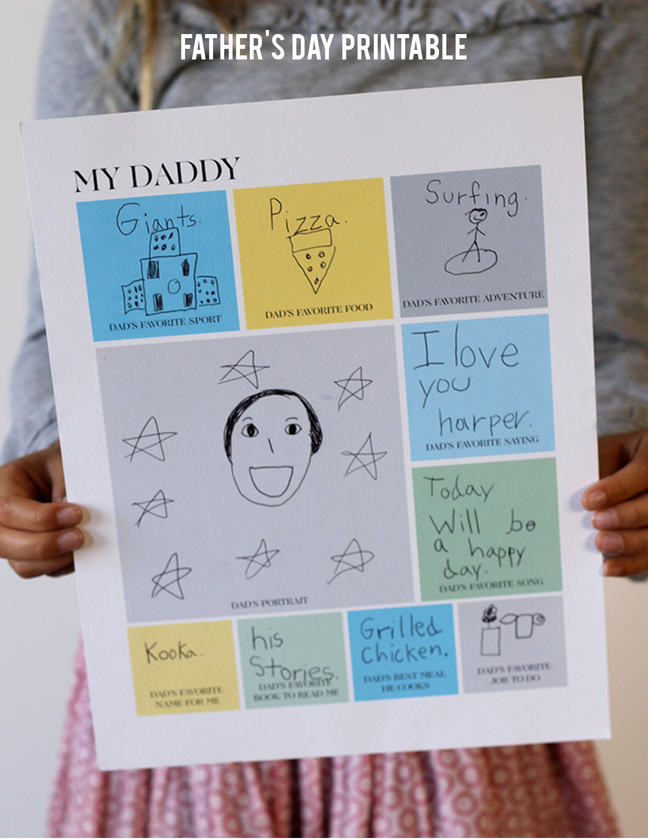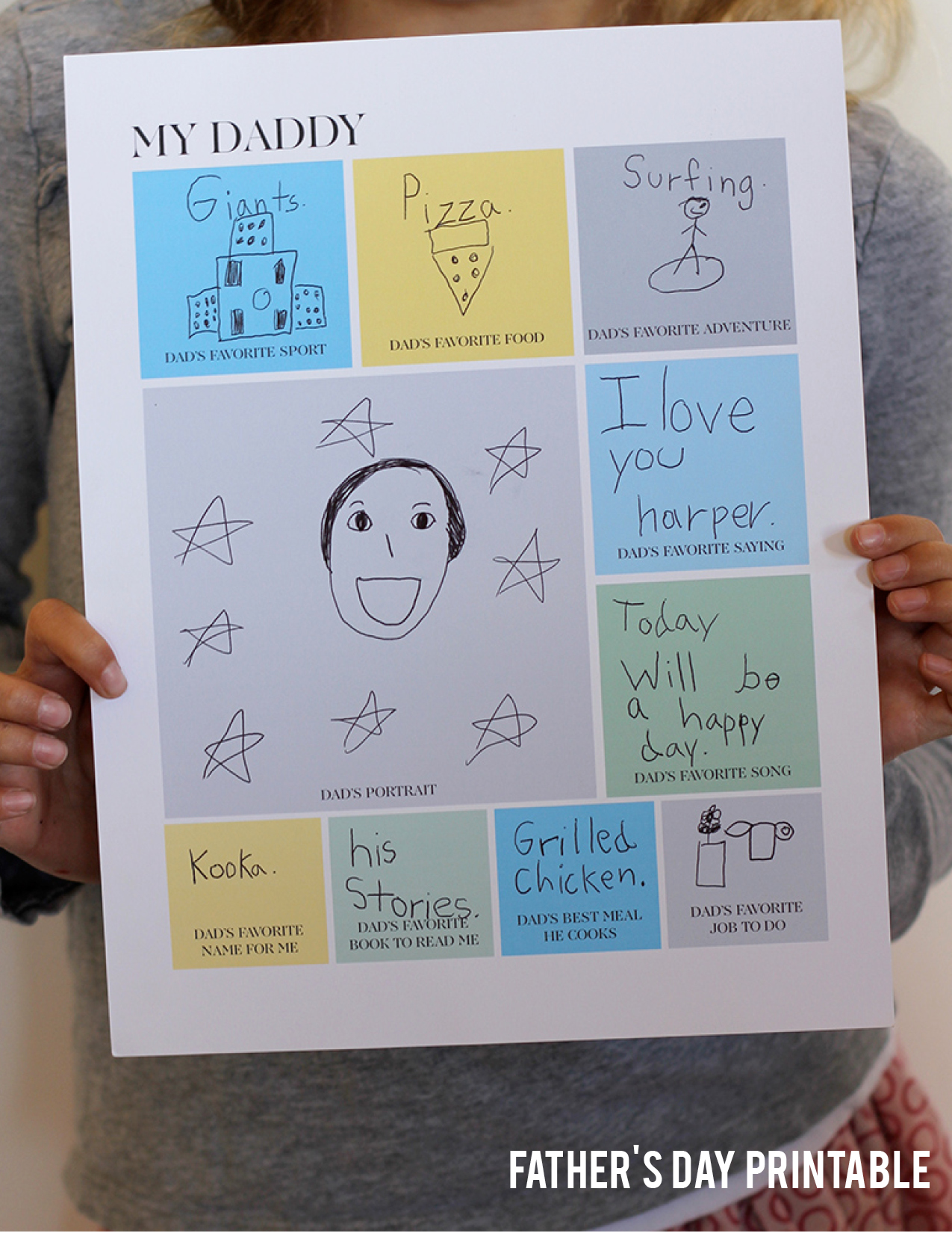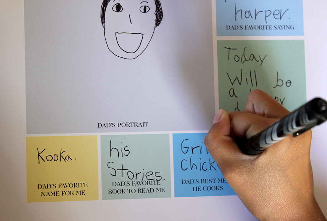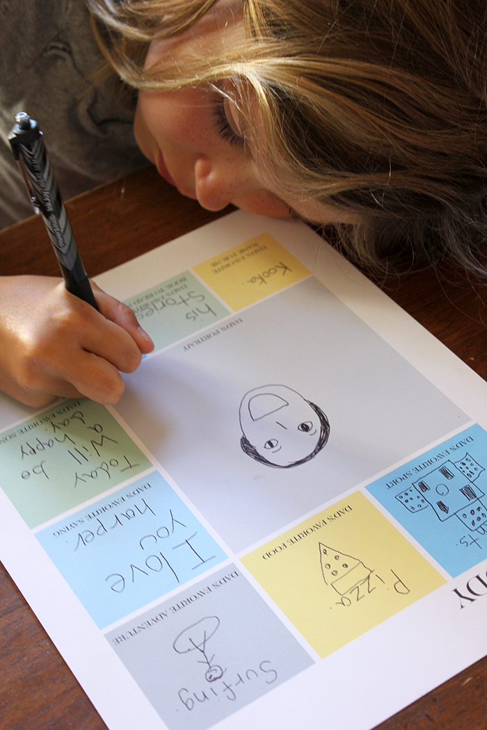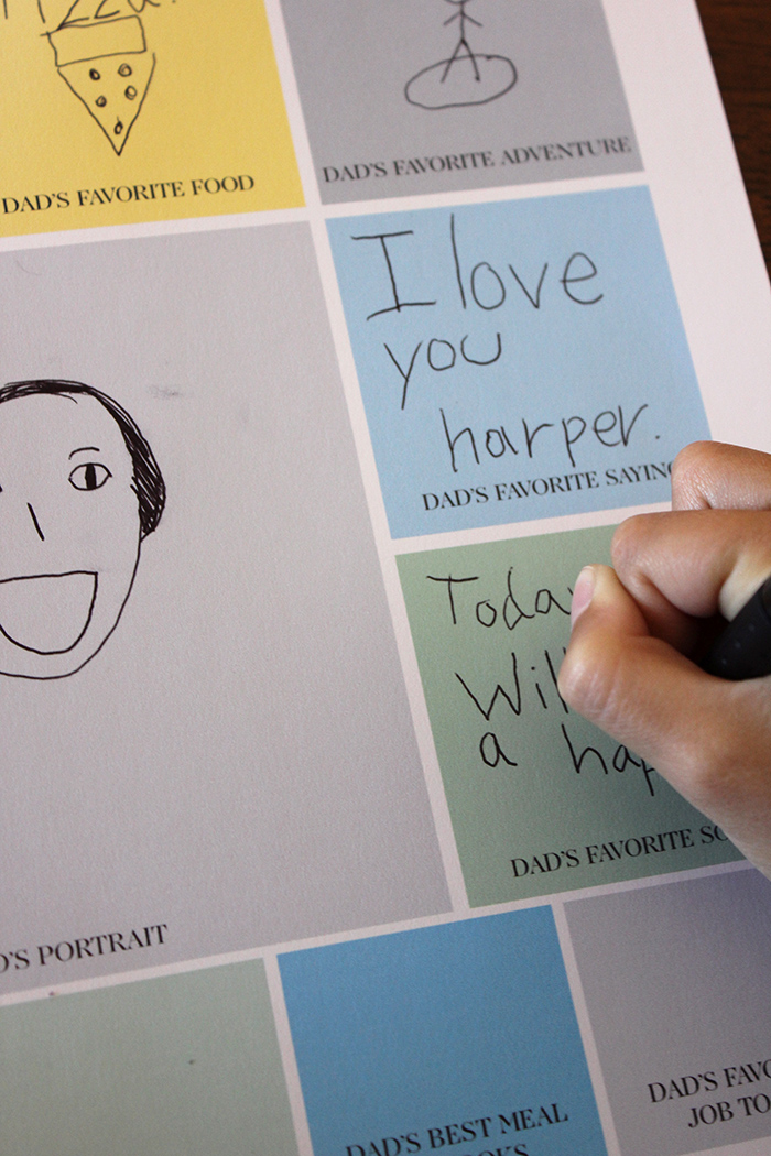 Harper loved filling this out for her daddy. As you can see, she drew out many of her answers, which is such a great reflection of her age. This will certainly be a gift dads will hang on to.