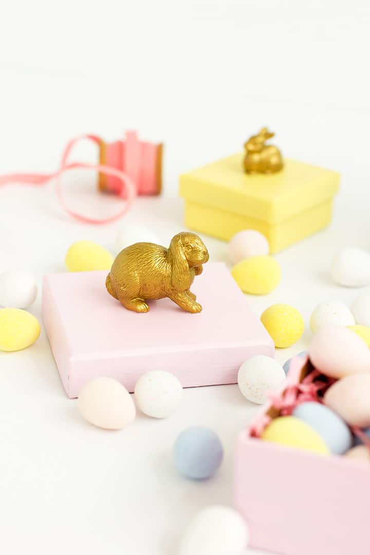 This is a perfect little gift box for kids and grown up alike topped with cute little bunnies. Fill the little treat boxes with Easter candy (like our favorites) and treasures. This DIY Easter Treat Box would make for a cute Easter display on a book shelf too, don’t you think?