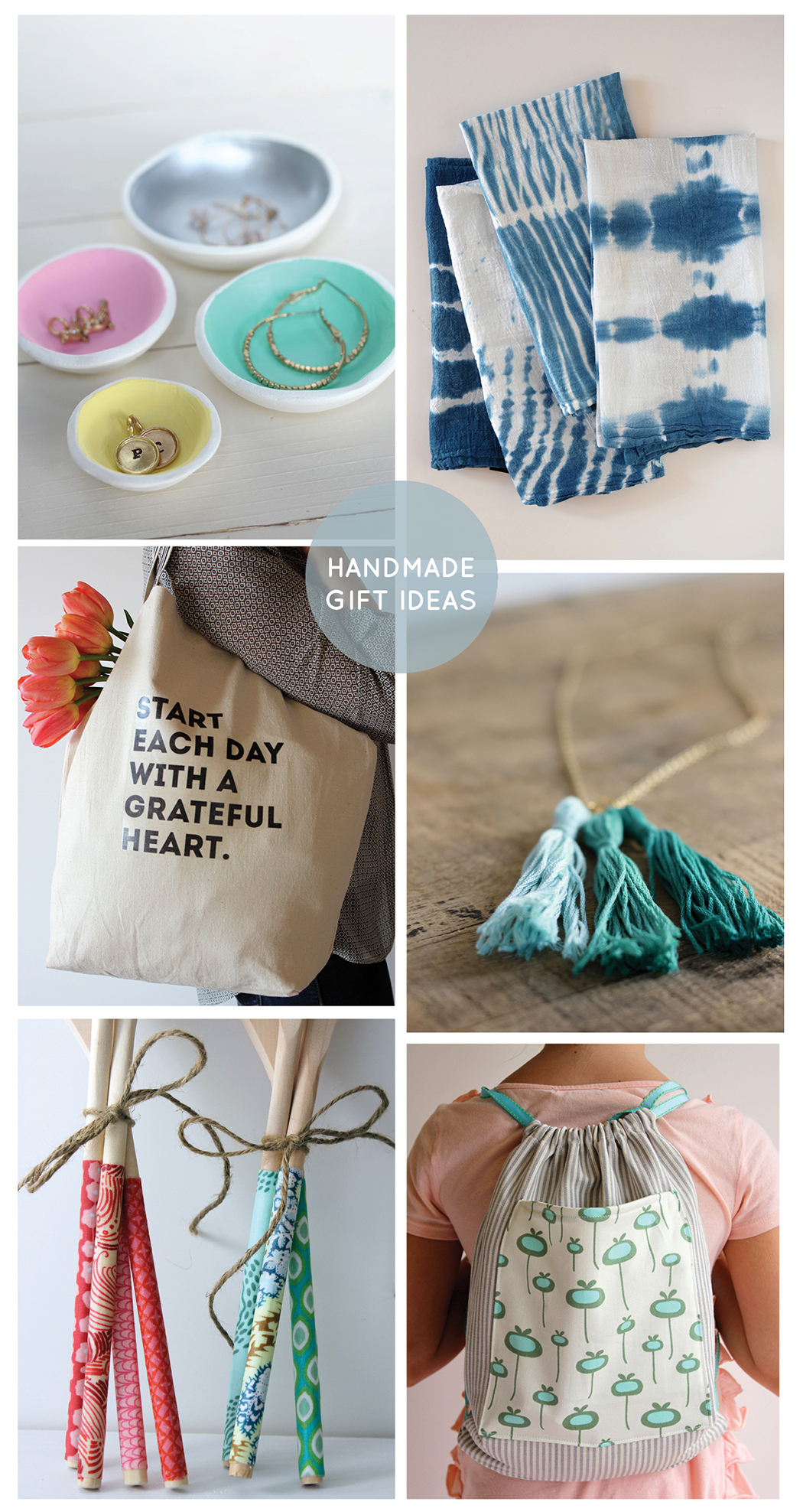 Air Dry Clay Jewelry Bowls // Shibori Dishtowels // Iron on Tote Bag // Tassel Necklace // Fabric-Covered Wooden Spoons // Drawstring Backpack