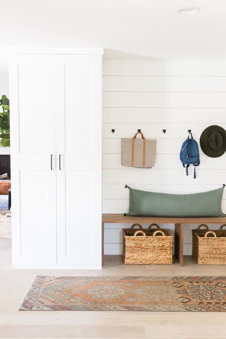 Such a great idea above by designer Jenny Komenda – she used Ikea Pax wardrobes to flank a simple bench in her Gentry home. With the addition of crown molding and shiplap it looks so custom and there’s so much storage in those wardrobes!