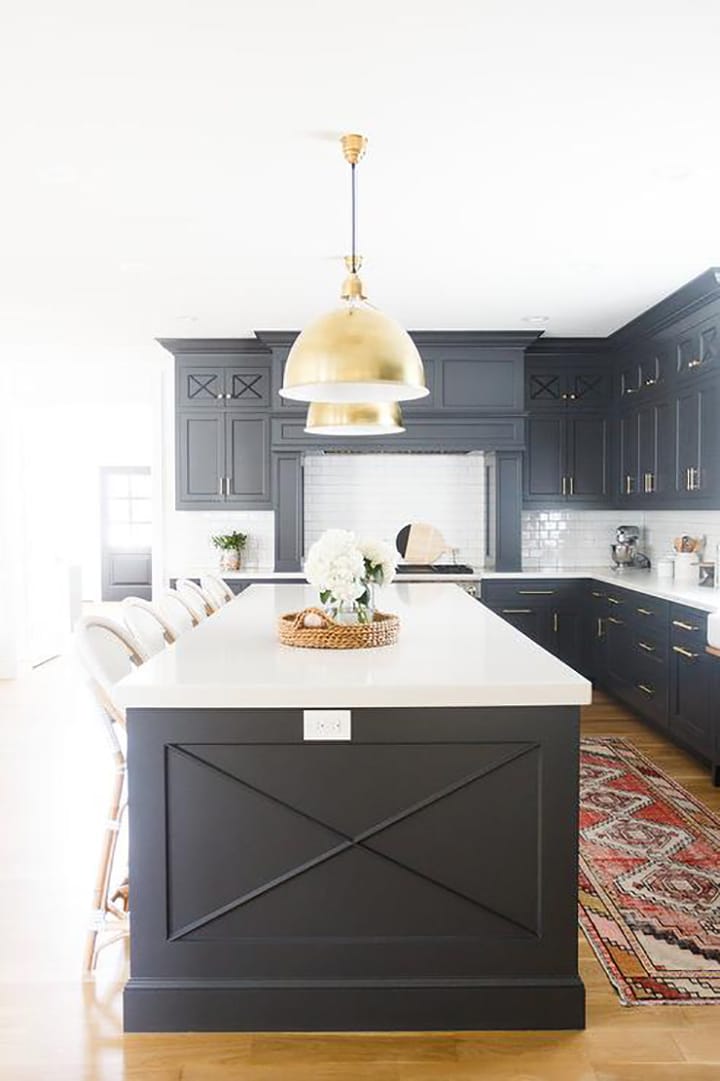 Cheating Heart 1617 (Benjamin Moore): A dark charcoal that works in both kitchens and bathrooms. I love the idea of a dark kitchen island in Cheating Heart, paired with white cabinets in the surrounding part of the kitchen.