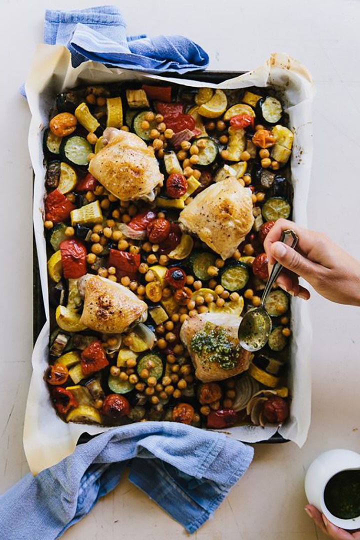• If using meats, go for cuts that roast well, and don’t need braising – we love using chicken breasts, bone-in chicken breasts and thighs and pork chops.