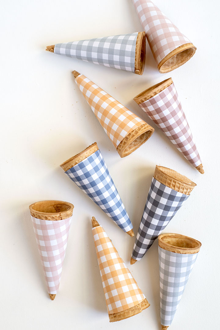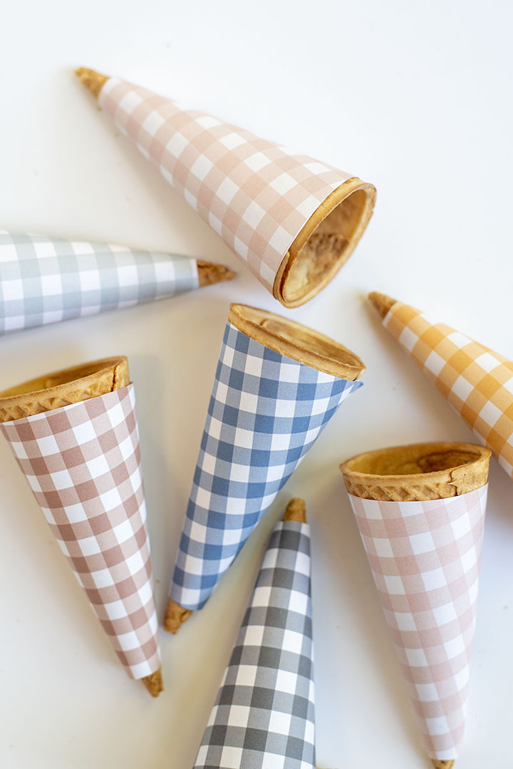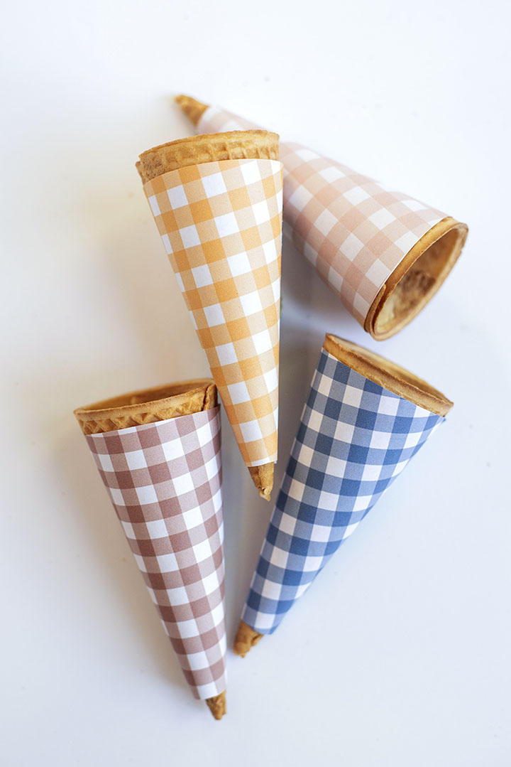 We designed these adorable Free Printable Gingham Ice Cream Cone Wrappers in some of our favorite colors of the summer. All you have to do is download and print these ice cream cone wrappers, cut them out and wrap them around some sugar cones. Tape together and you’ve got the cutest ice cream cones.