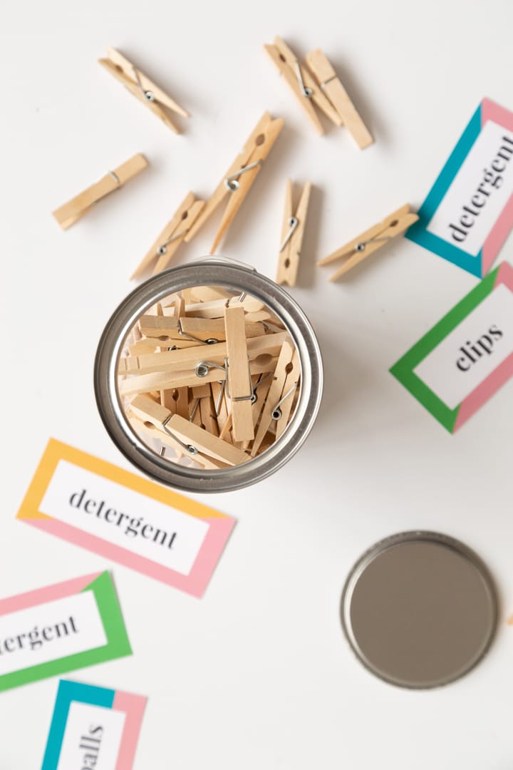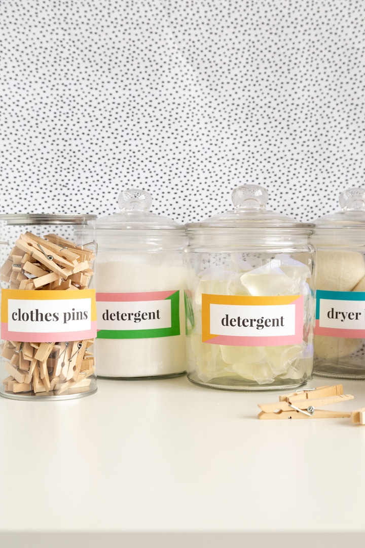 - Use glass jars or plastic jars to house laundry detergent, dryer balls, dryer sheets, sewing supplies and more