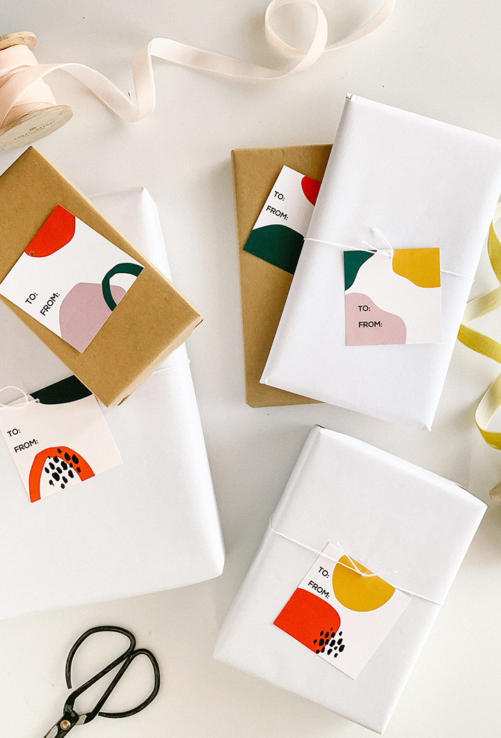 Print on white card stock, cut out, punch a little hole in the top and add to your gifts! These look great on solid white, Kraft or black wrapping paper. I love how the simple white wrapping paper looks so mod with these printable gift tags.