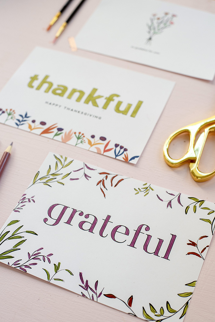 We used colored pencils, markers, acrylic craft paint and cute washi tape to personalize our cards that we’re sending off in the mail to wish our family a Happy Thanksgiving. We designed these as 5×7 cards with phrases like “So grateful for you,” “Thankful,” and “Grateful.”