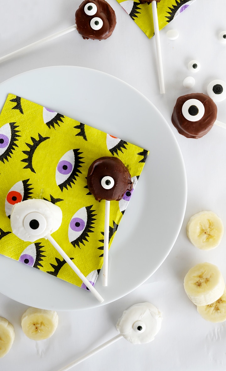 Cut bananas into 1/2 inch slices and using a fork, dip each slice into the chocolate coating each side. Place each slice on a parchment lined cookie sheet. Put an eyeball, or two or three, on each chocolate-dipped banana slice. Put cookie sheet in freezer for up to three hours to set. About twenty minutes in, pull sheet out and insert lollipop sticks, then freeze fully.