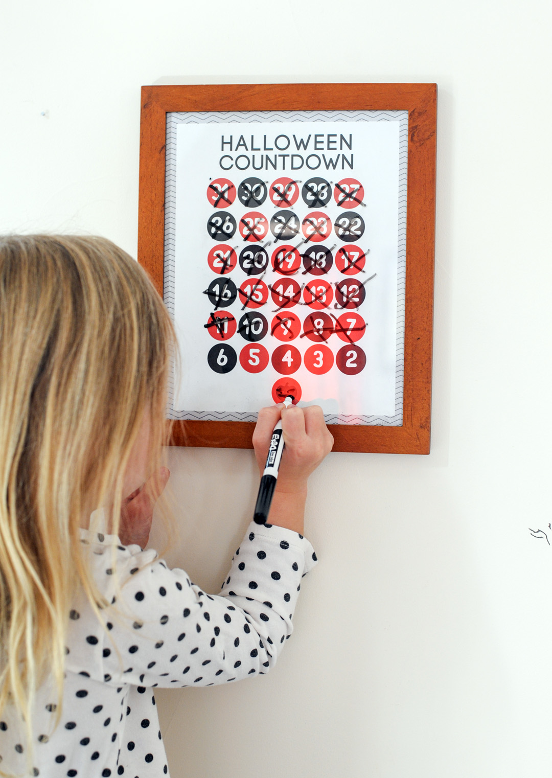 Halloween printables from aliceandlois.comHere are some fun free Halloween printables for you guys. The girls have been loving the Halloween countdown. We printed and put ours in a 8×10 frame. Each day, the kids can cross off a day with a dry erase marker. Just use it right on the glass. It will wipe right off when you’re done! The Trick or Treat printable and the Witches Go Riding print are festive additions to your Halloween decor. Just print out, frame and you’ve got some fun Halloween prints. It’s our gift to you!