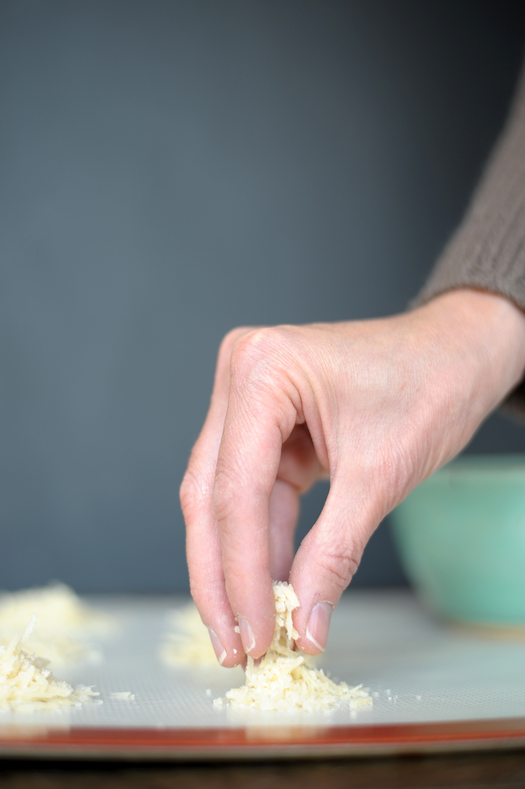 2. Take a heaping tablespoon of grated parmesan cheese and place in a heap on a silpat or parchment paper. Place parmesan piles about 1/2 inch apart. Pat down with your fingers.