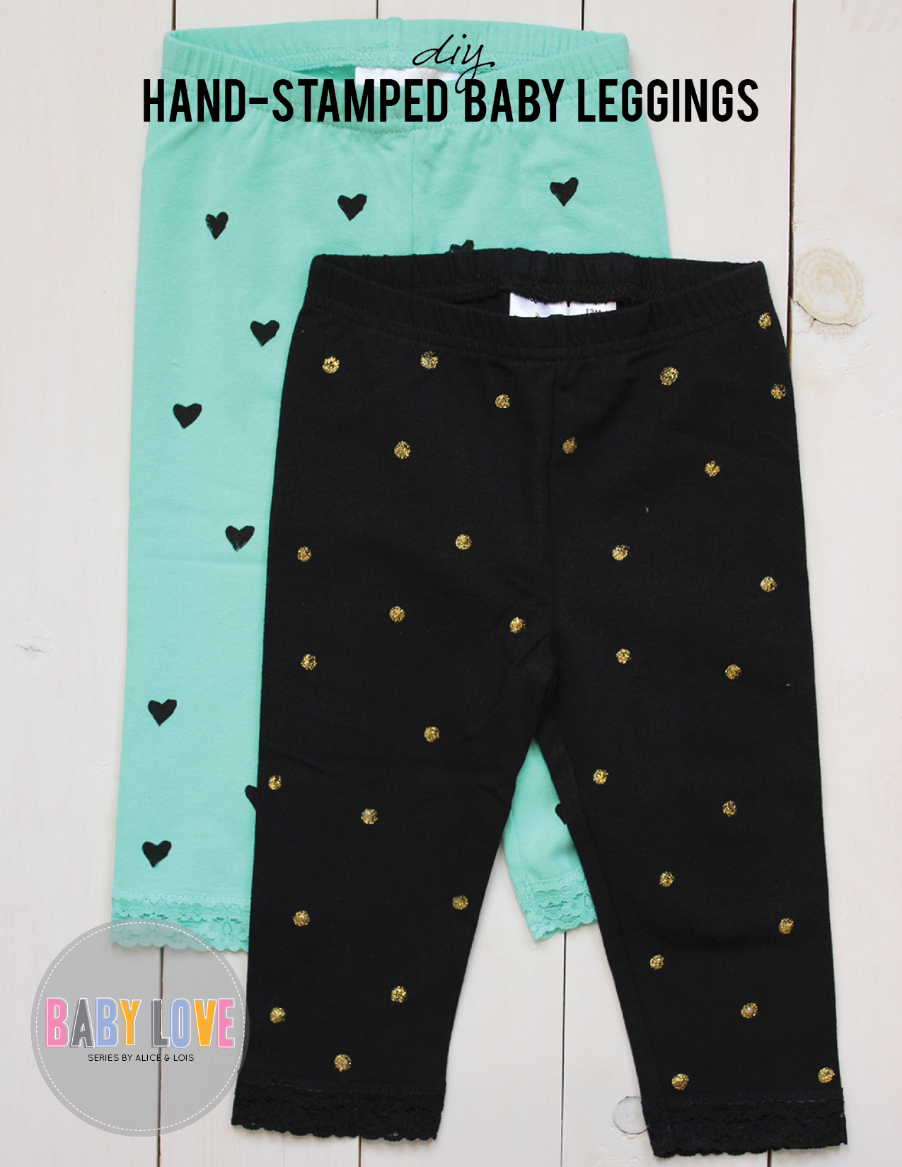 DIY hand stamped leggings on aliceandlois.comBabies are woven into our everyday lives. So we wanted to celebrate them with our new series, Baby Love. For the next six weeks we will be sharing our love for babies through DIY projects, recipes and wellness. Join us for some Baby Love!