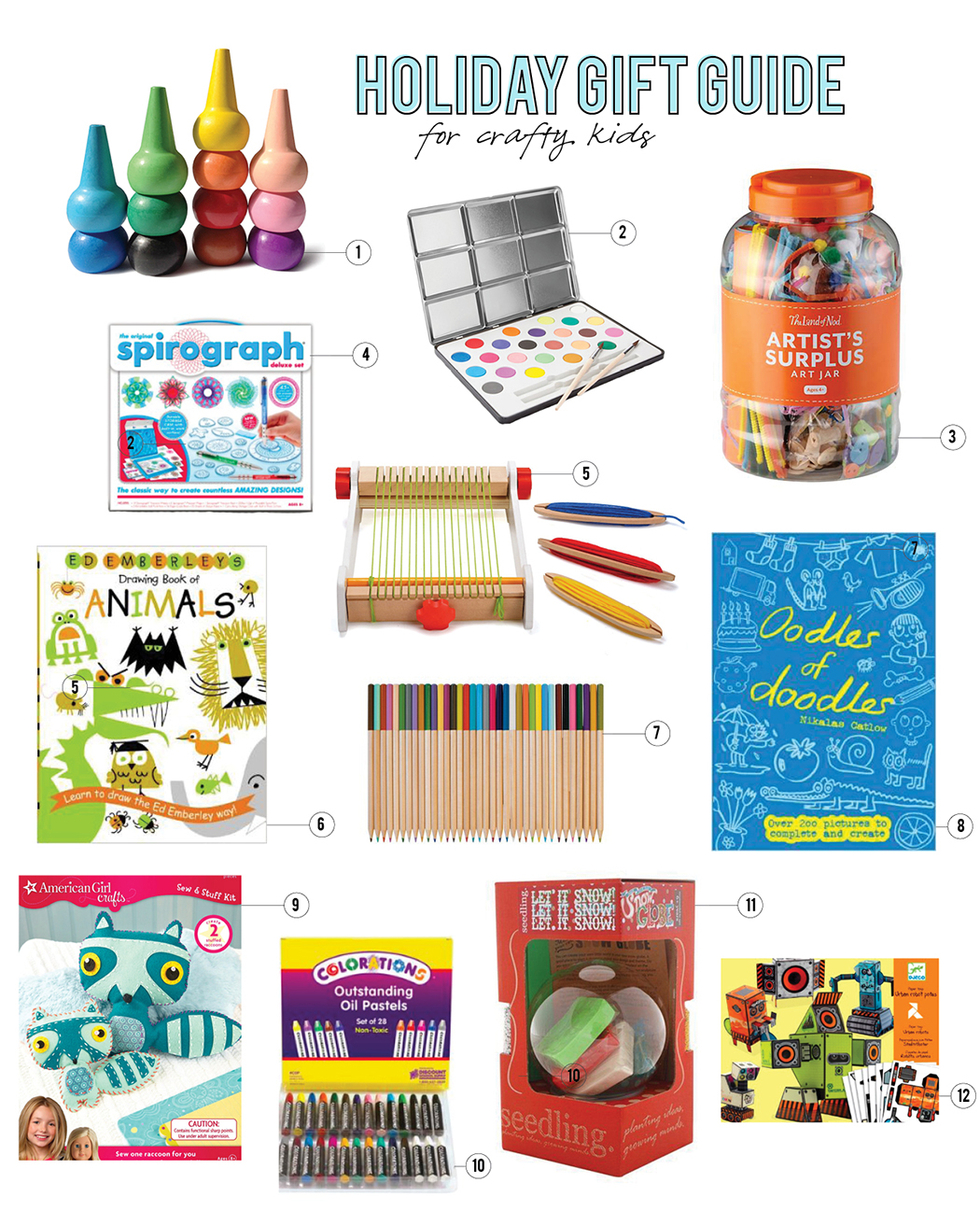 1. Playon Crayons // 2. Paint Set // 3. Artist Supply Jar // 4. Spirograph Kit // 5. My First Loom // 6. Animal Drawing Book
