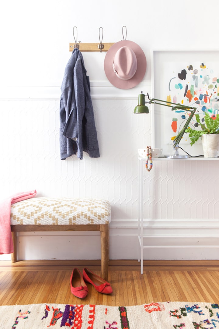 Add a pop of color by painting the inside of front door. We love the dusty rose pink door from Lulu & Georgia.