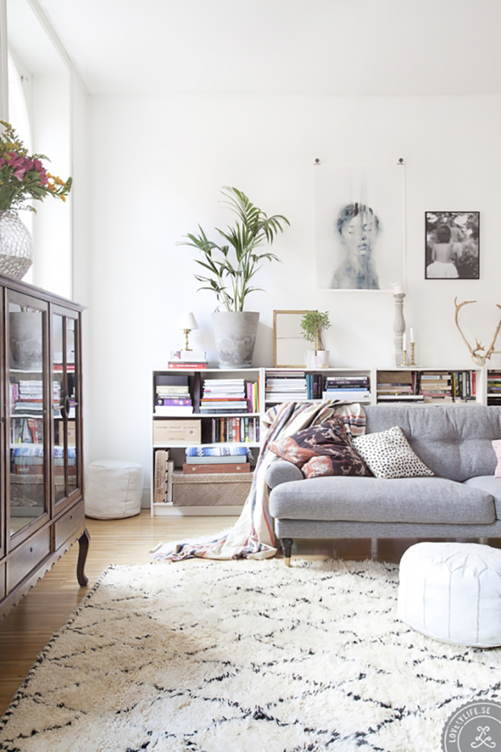 Over the next few months I will be sharing some of the rooms in our apartment. I have been adding lots of inspiration to our Home Sweet Home Pinterest board, follow along. Each week I will focus on a particular room or design element in the Home Crush column. This week, I am starting with design inspiration for the living room – the center of our place. This is what I am working with – I have ordered a Moroccan style rug and have a dark brown sectional couch that we had in our old place (now split into two pieces). I am looking for lighting, coffee table, window coverings and end table inspiration. And you might notice a similar item in a few of the pictures – a leather butterfly chair. That is definitely on my wish list. Here are a few of my favorites. I am loving the bright white walls and the patterned rugs.