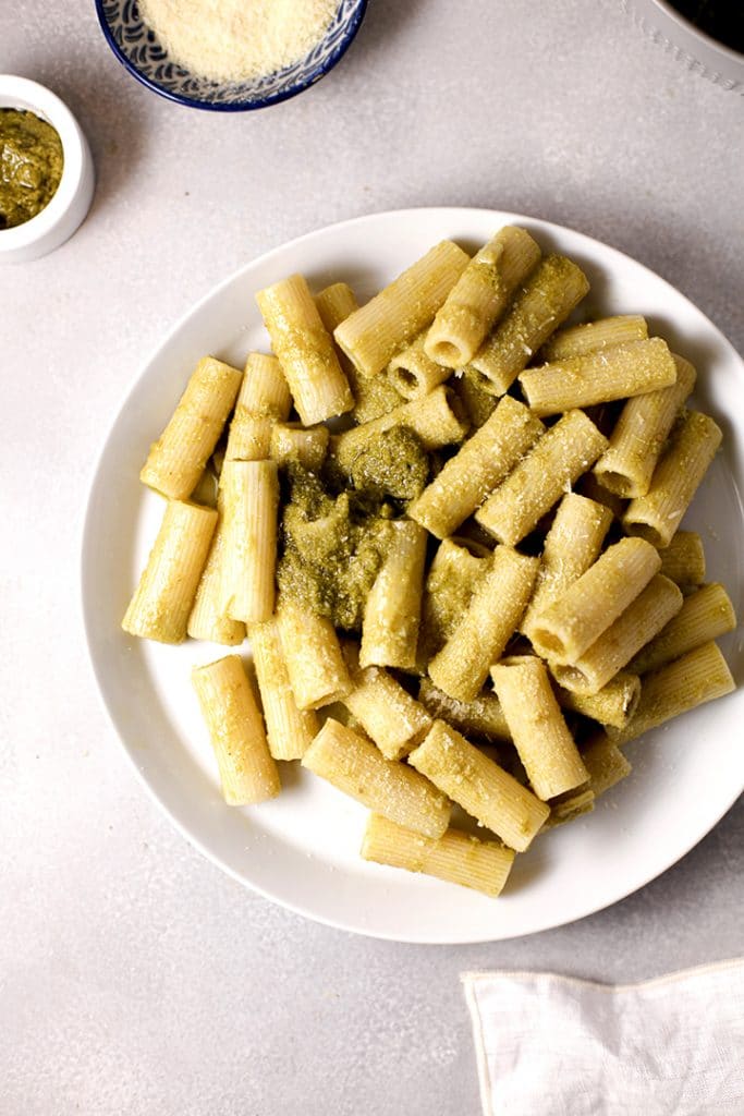 Are you ready for a spin on the traditional pesto? Today we are sharing a divine Kale Pesto Pasta recipe that is so delicious. Kale, almonds, EVOO, garlic and parmesan make up the sauce. It is seriously so so good. You will want to top every kind of pasta, salmon and grilled chicken with it! And if you haven’t had homemade pizza with pesto, you are missing out.