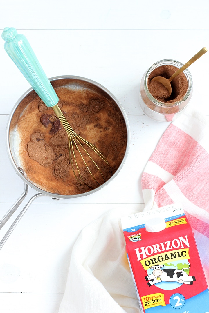 I used 1 teaspoon cocoa, 2 teaspoons of sugar and a tiny dash of salt to one cup of milk. I poured milk into a saucepan and heated, adding the hot chocolate mix. Stir with a whisk.