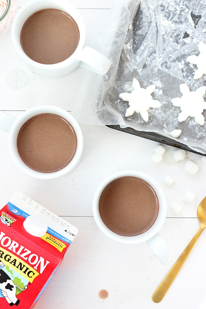 I don’t know about you, but we love any excuse to have a “build-your-own-anything” station at a gathering. But, we like to keep it simple. Today we are sharing how to build a simple hot chocolate bar and make homemade whipped cream snowflakes for a Fall or Winter party. You can make your own hot cocoa mix for this hot chocolate bar, but using store bought would be just fine. A friend of ours makes the coolest whipped cream cubes by freezing homemade whipped cream and we had to give it a try! We are delighted to be partnering with Horizon Organic. today to show you how to set up a simple hot chocolate bar and how to make homemade whipped cream, turning it into snowflakes to top off your hot chocolate! This is a delicious and easy treat when you have holiday guests over for any occasion. Horizon Organic milk is a favorite of our kids, especially after a day playing after the leaves or wintery snow.