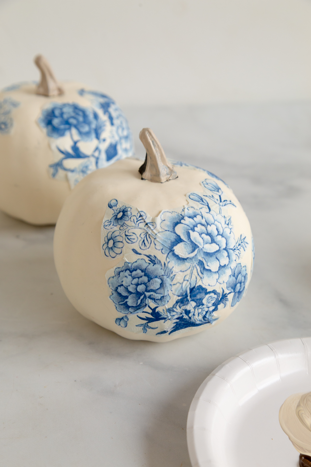 You can either use real pumpkins or faux for this craft project. Ceramic pumpkins could even work. We used faux pumpkins for beautiful chinoiserie pumpkins project. You can find them at craft stores and big box stores like Target or Walmart. We love the mini white pumpkins from Target.