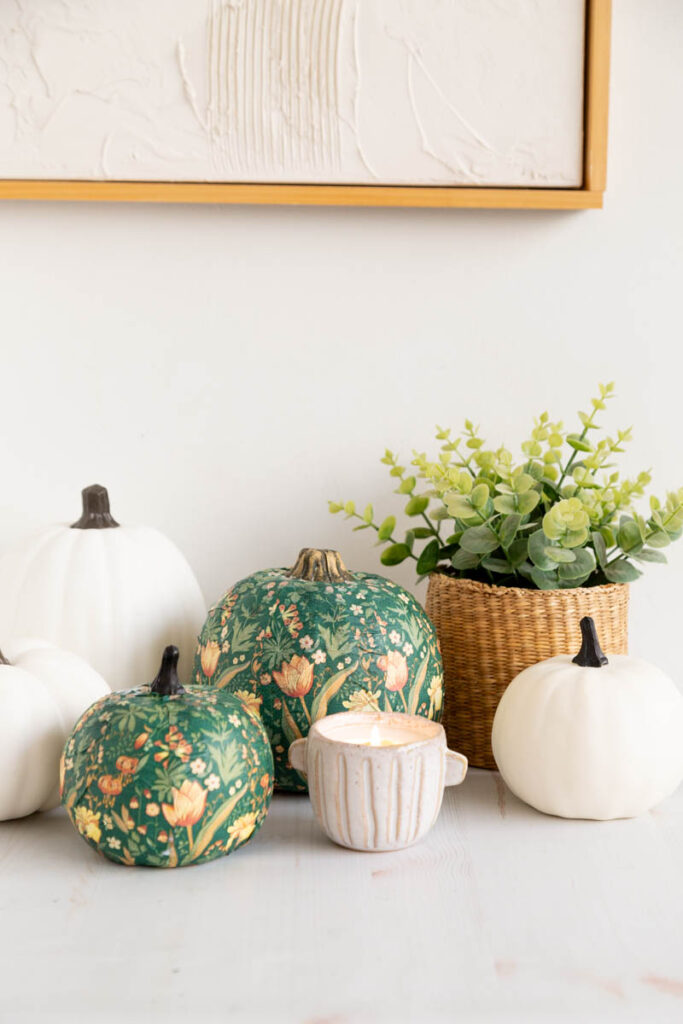 - Simple materials – paper napkins, Mod Podge and a paint brush! That is all you need to make this craft. You can use real pumpkins or faux craft pumpkins.