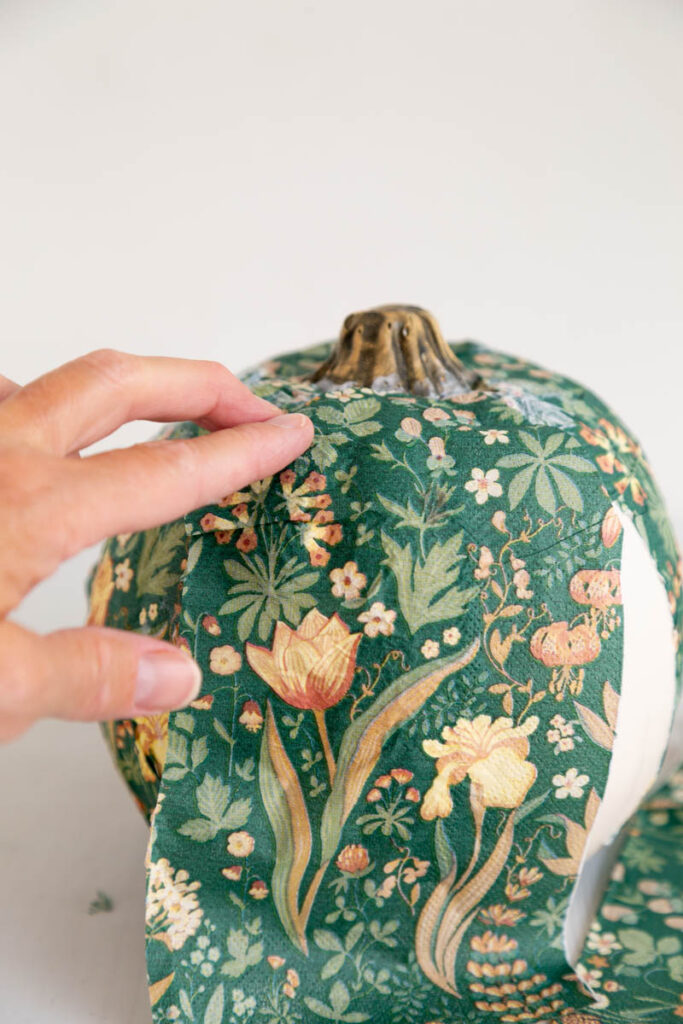 - Now it is time to adhere the strips of napkin to the pumpkin. First apply a thin layer of mod podge to the section of pumpkin. Then gently press the napkin onto the pumpkin. Use your fingers to gently smooth out the paper.