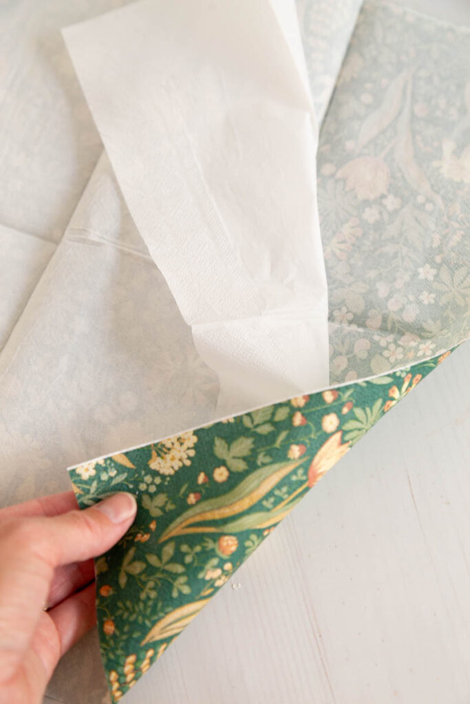 - You will first want to remove the back layer of the napkins. This will almost give you a tissue paper like material to decoupage onto pumpkin.