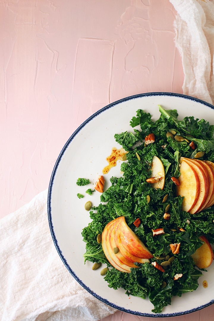 We are always on the look out for a new kale salad recipe and we think you’re going to agree with us, that this is going to be your new go-to recipe. This Kale Salad with Apples and Nuts is so simple to make. The secret to a delicious kale salad is massaging the kale with olive oil and vinegar and then letting it marinate for a couple of minutes. With kale, you actually need that break down in order for the leaves to soften up. This also helps to pack up the kale with more flavor.
