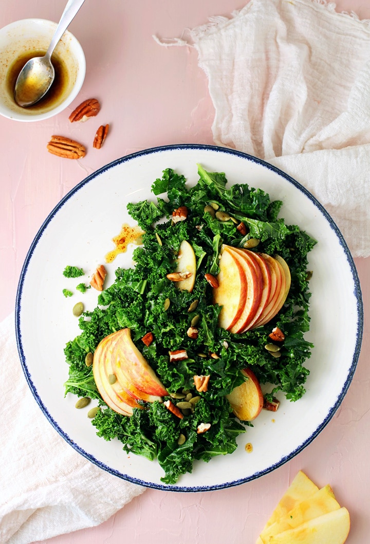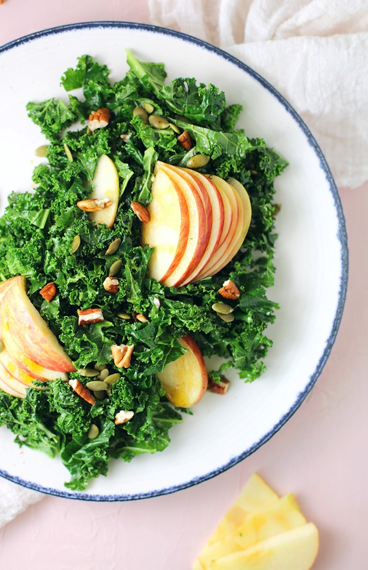 We are always on the look out for a new kale salad recipe and we think you’re going to agree with us, that this is going to be your new go-to recipe. This Kale Salad with Apples and Nuts is so simple to make. The secret to a delicious kale salad is massaging the kale with olive oil and vinegar and then letting it marinate for a couple of minutes. With kale, you actually need that break down in order for the leaves to soften up. This also helps to pack up the kale with more flavor.