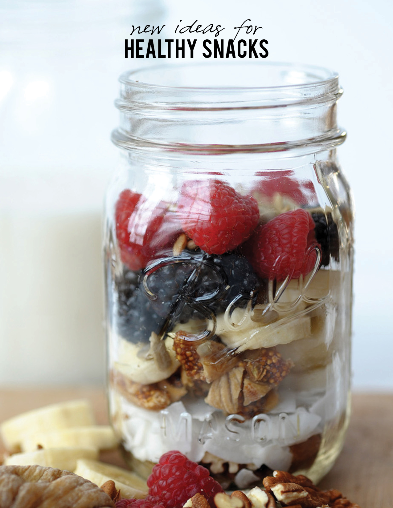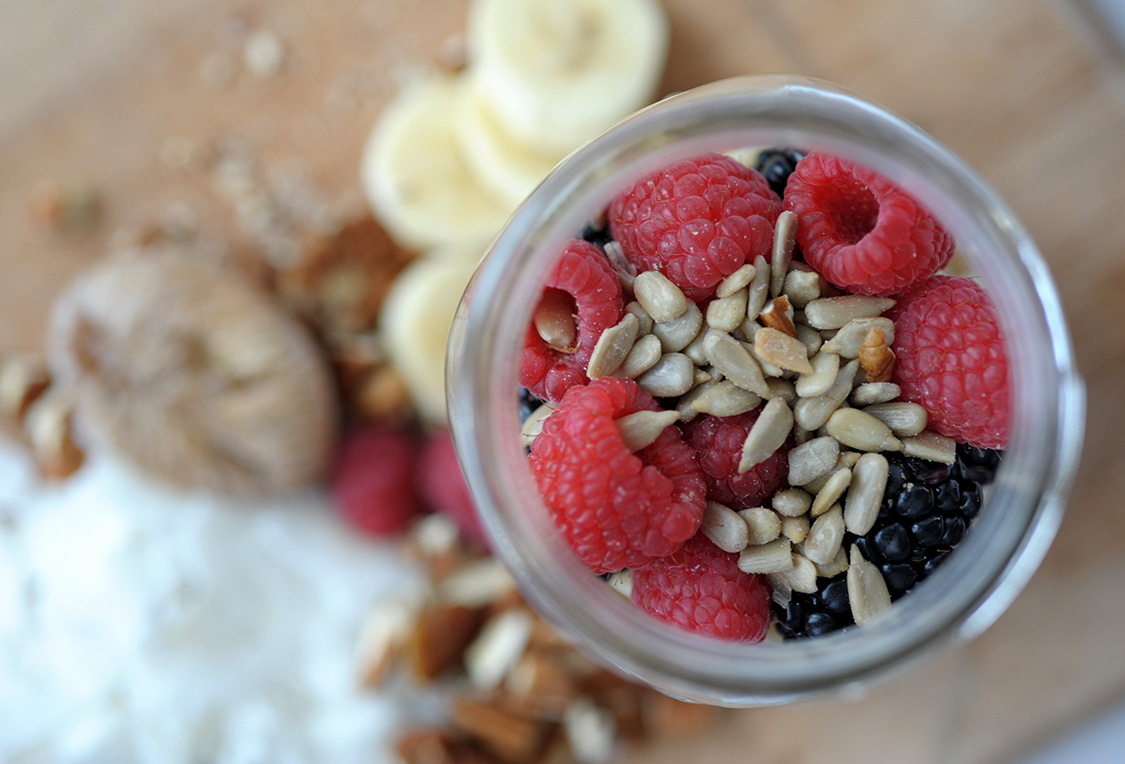 Jar of Goodness In a small mason jar layer any type of raw chopped nut  (almonds, cashews, walnuts, pecans, etc) with shaved dried coconut, dried figs, fresh sliced banana, fresh berries, ground flax and sunflower seeds.  Top with walnut or almond milk.  If eating later, put the milk in a separate small jar until you are ready to eat.