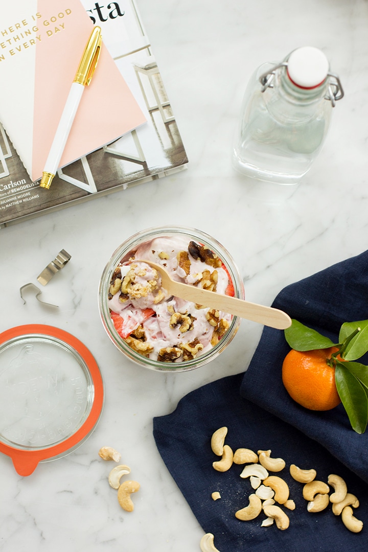 noosa is a combo of sweet and tart, made with whole-milk and all natural ingredients. The new flavors are amazing – orange and ginger, strawberry and hibiscus and pear and cardamom. These have the perfect balance of fruit & spice! Ok, so now to the quick yoghurt parfaits…