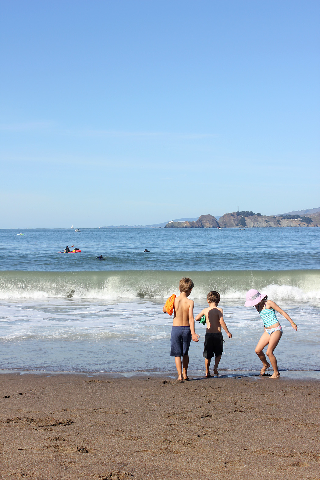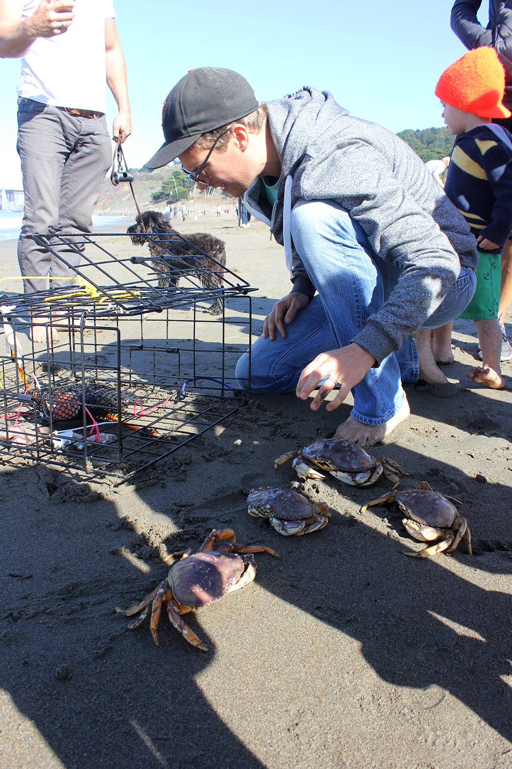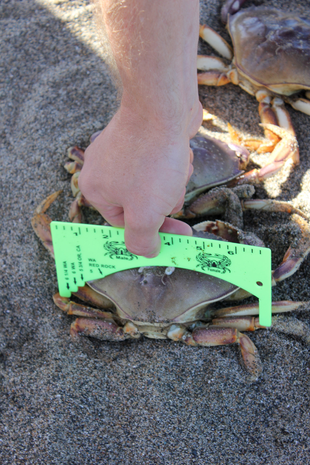 Crabbing on Baker Beach is fun for the kids as well. They race to the guys as they bring in the traps to see what types of crabs were caught. There are regulations as to size and types of crabs you can keep. Minimum size for Dungeness crab is 5 3/4 inches. There is a special measuring tool to use and you can only keep the males. Yesterday some pregnant females got in the traps. The kids were amazed at the orange sack/belly. We gently put them back in the water.
