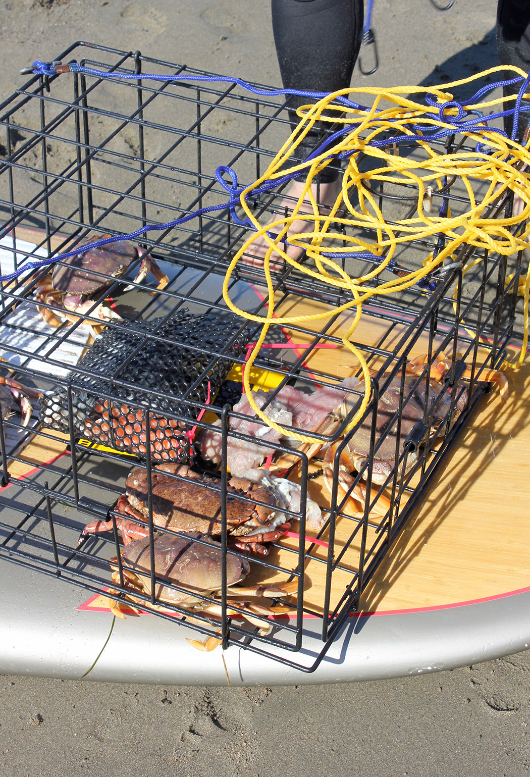 – Paddle out on surfboard to set box trap. They bungee the traps on top of their boards. The crabs come in through a one way door to get the bait. Raw chicken worked best yesterday. The guys used raw salmon yesterday as well. They would paddle the traps out on their surf boards and let the traps soak for at least thirty minutes before heading back out to check on how many crabs had climbed in. They also had a hoop trap that lies flat on the bottom of the ocean.
