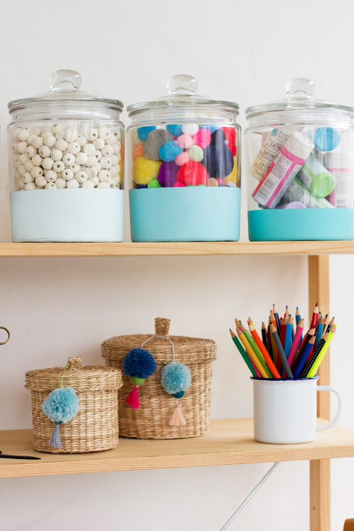 You might remember the no-sew rope basket I made a while back. It is a go-to basket for my fabric stash. Today I’m sharing a DIY project I made for Oriental Trading with their glass jars. I added paint in a blue mono-chromatic look. I love how they turned out. The jars are holding my stash of twine and ribbons, washi tape, wood beads and more! Head over to Oriental Trading’s blog for the full tutorial.