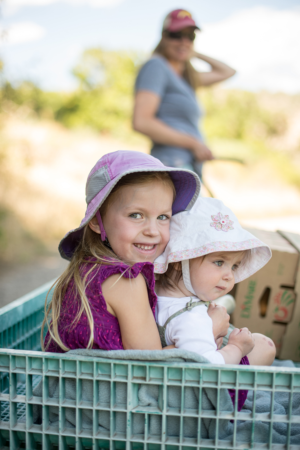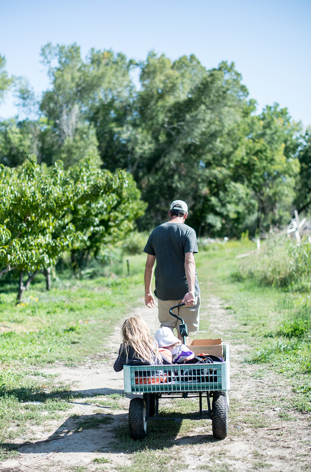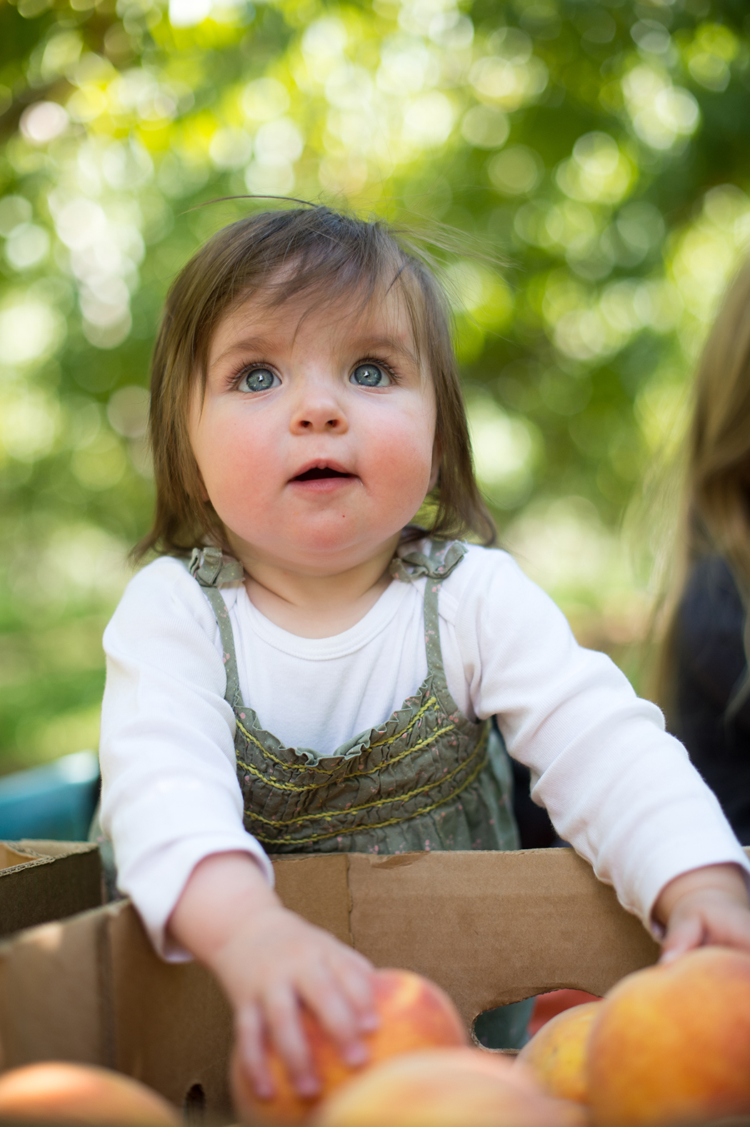 Calla had such a great time spotting the perfect peach then climbing on her daddy’s shoulders to pick it. She exclaimed an hour into picking, “This is the best day ever!” Gotta love hearing that from your five year old. Poppy loved, I mean loved, riding in the wagon. She would inspect each peach as we placed them in the boxes.