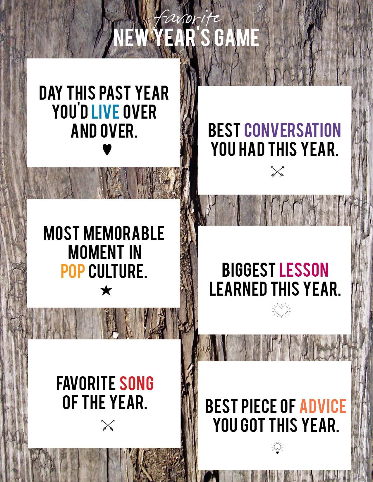 Free Printable New Year's Game from aliceandlois.comHere’s a fun way to get the conversation started at your New Year’s soiree. Print out these Printable New Year’s Game cards (there are more on the free download) toss them in a bowl or glass jar and have your guests start answering. It’s a great way to reflect, to laugh a bit and to learn more about the past year.