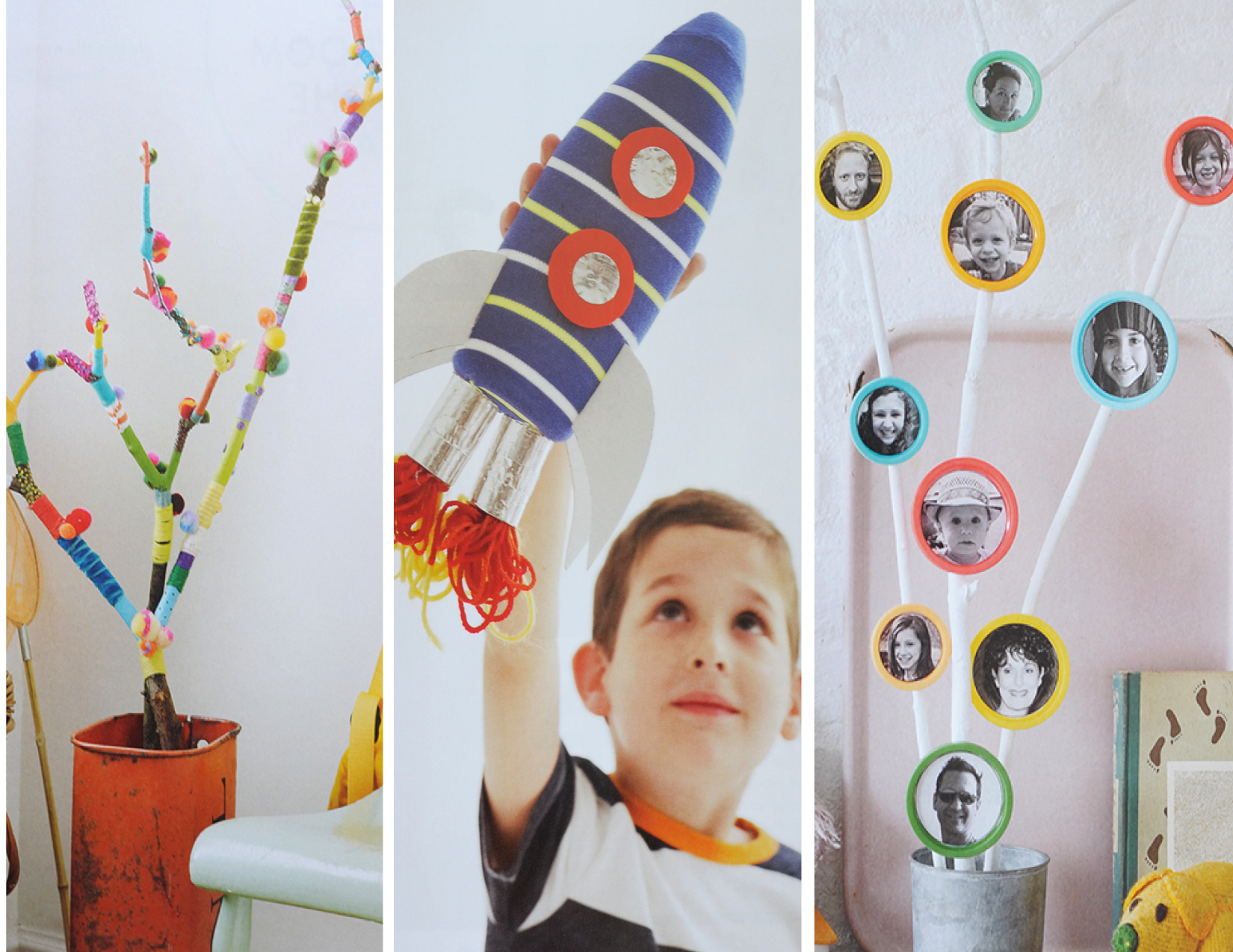 One thing I love about this book is that she has an entire section dedicated to recycling everyday objects and turning them into an art project. There’s a bottle rocket made out of a sock (don’t we all have a missing sock pile) and a soap bottle. Then I adore the idea of taking old playdough caps and transforming them into a modern family tree. She inspires you to look at your recycling bin in a new light. Turn those cracker boxes and cereal boxes into a village.