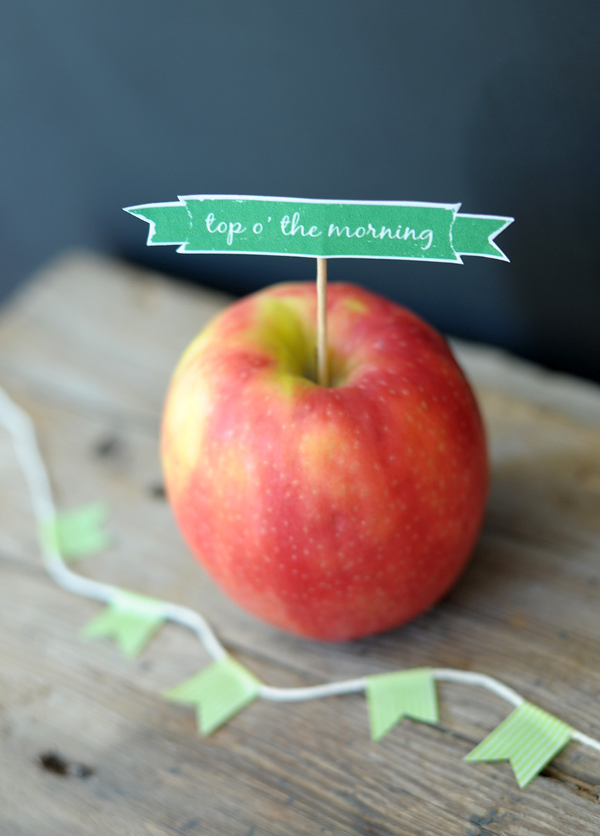 You just have to cut out the banner, tape it to a toothpick, and your festive breakfast is ready. This little sign would also be cute atop a donut, stuck into an apple or on the top of a muffin. I’ve designed two different versions for you to use!