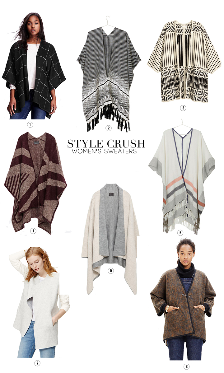 1. Old Navy Poncho / 2. Loft Double-Line Poncho / 3. H&M Jacquard-Knit Cardigan / 4. Zara Jacquard Poncho / 5. Zara Double-Sided Cardigan / 6. Sienna Stripe Poncho / 7. Loft Merino Wool Jacket / 8. Madewell Sweater Poncho