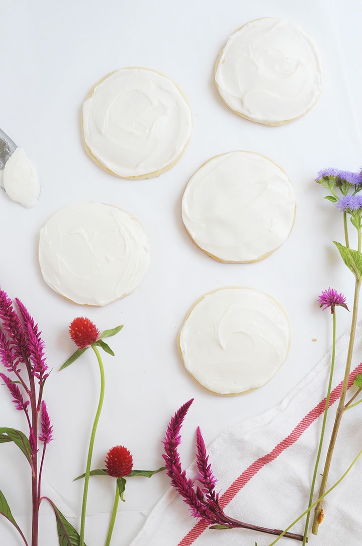 Every time our girls are at our parents’ house, it’s a tradition to make sugar cookies. It doesn’t matter if it’s the middle of the summer or Christmastime, our mom’s famous sugar cookies are made! This sugar cookie recipe is a family favorite any time of year. They are the perfect balance of butter and sugar – a total treat. Last week the girls were cutting out circle shapes to bake and decorate. I then tried to come up with a way to put a summery spin on the sugar cookie when I looked up at little vases filled with mini bouquets that my seven-year-old had put together. Why not top the cookies with fresh flowers? As we know, flowers make everything better.