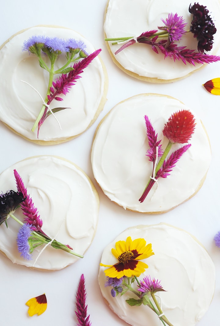 Ice your cookies and put in fridge for a half hour, until frosting is set. While cookies cool, create mini bouquets of fresh flowers. Cut little blooms down to 2 to 2 1/2 inches and tie together with string. Place bouquets gently on cookie. Of course, these bouquets are not edible. But it’s good to remind your cookie eaters that they can’t eat the flowers 🙂