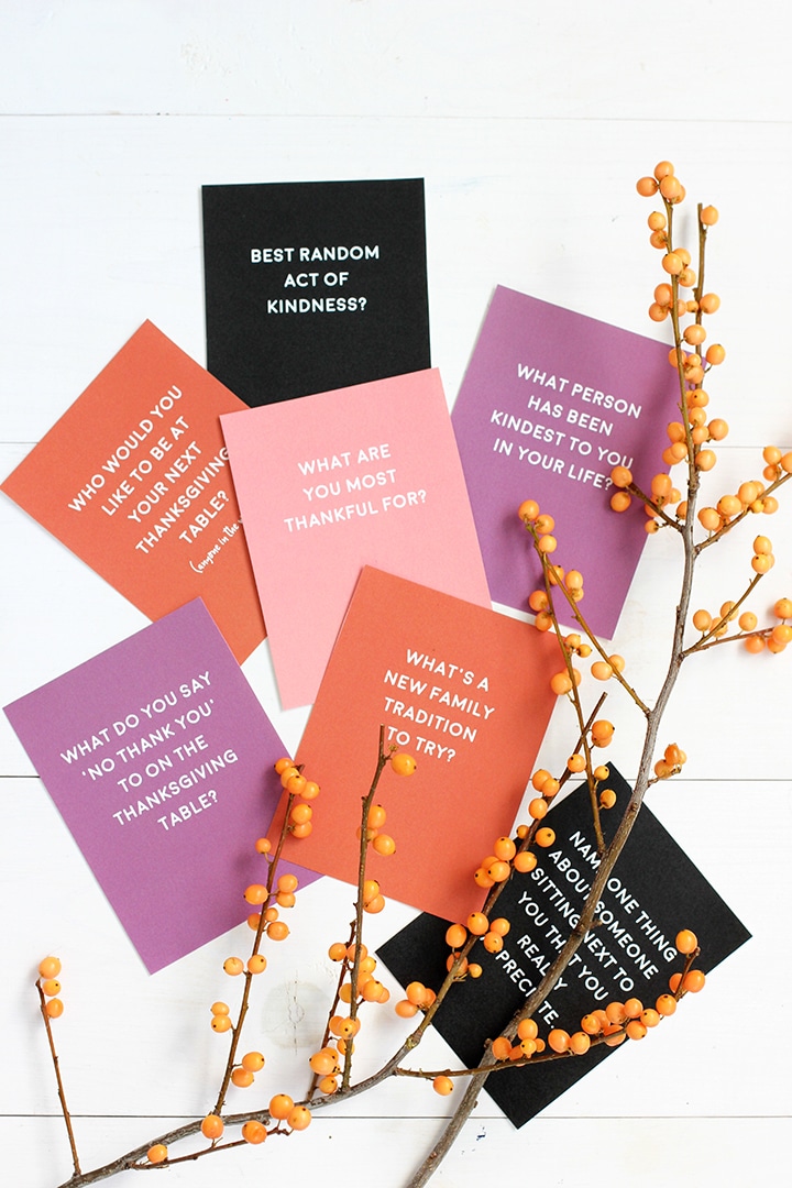 There are so many ways to play this Thanksgiving Questions Game! We love to put all the cards in a glass bowl and pass them around. Each guest picks a card and they have to answer. Then throw your card back in and pass around again!