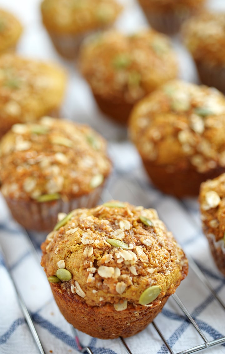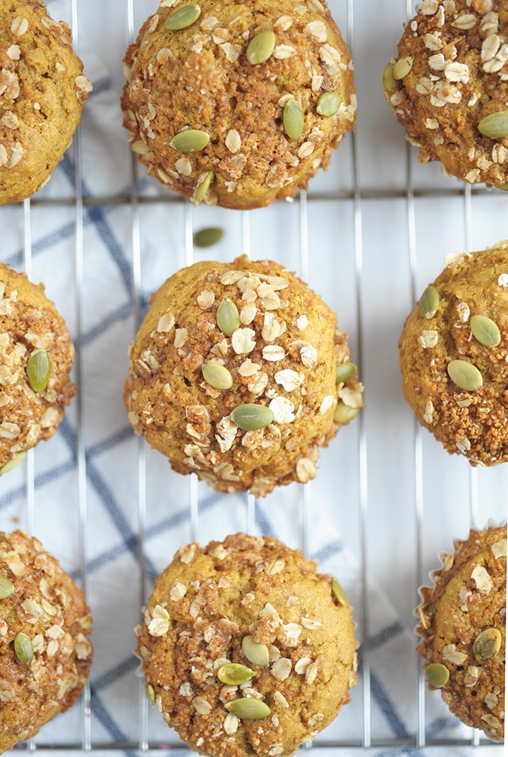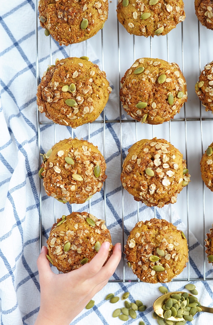 This pumpkin muffin recipe is a family fave and our top better-for-you breakfast treat. With hints of sweet pumpkin, the molasses flavor of scant (pure dried sugar cane juice), classic pumpkin pie spices, and finished off with an oat and pumpkin seed crumb topping, it really is the best pumpkin muffin!