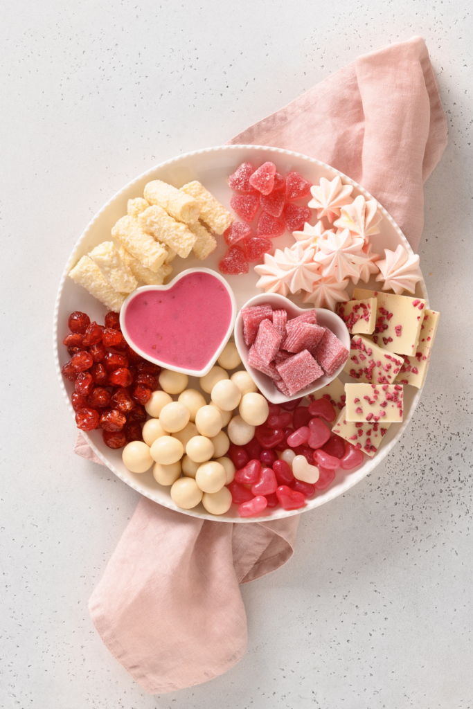 Valentine Dessert Board – we love a good and easy dessert board! Grab some pink, red and white candy, red berries, yogurt covered white pretzels, dried cherries, etc! Arrange on a wood cutting board for a darling dessert!