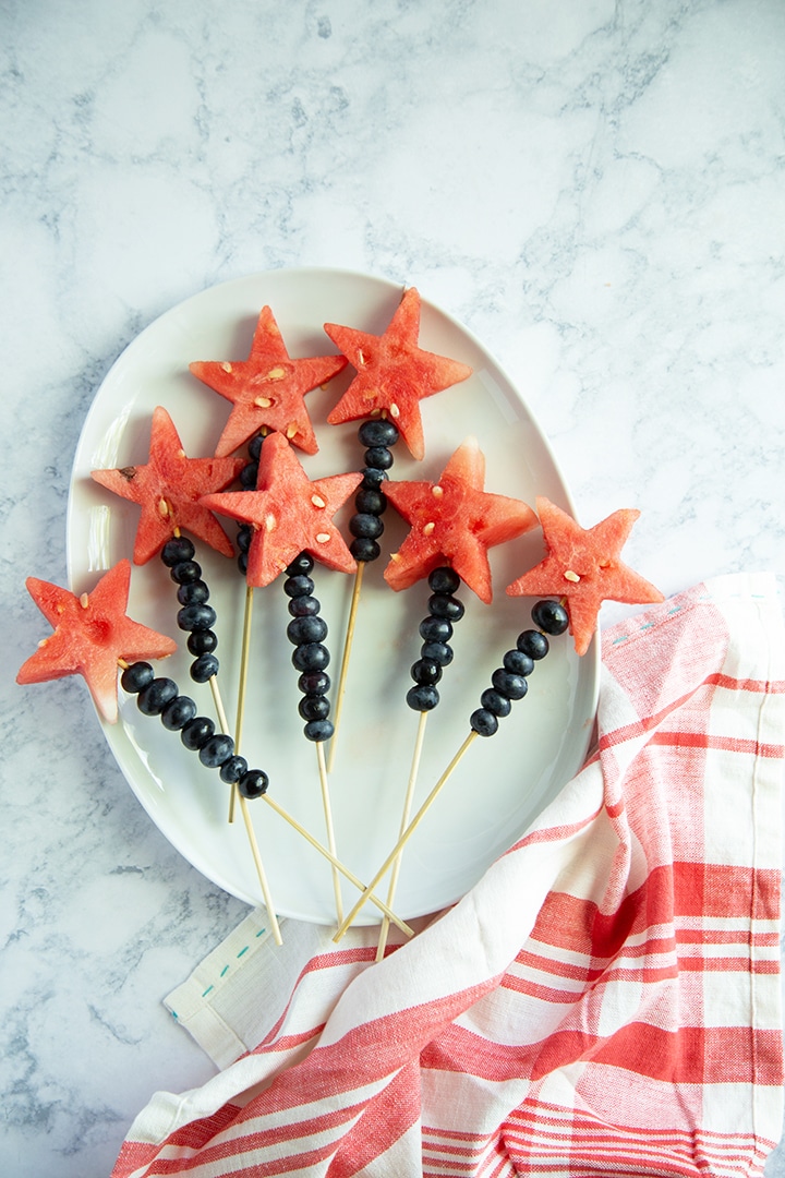 These might just be the perfect way to enjoy watermelon on the 4th of July, don’t you think? I made this video version of an old favorite post of ours, Fourth of July Watermelon Wands. The skewers are incredibly easy to make and the kids love them! All you need is a good watermelon, blueberries, knife, star cookie cutter and skewers.